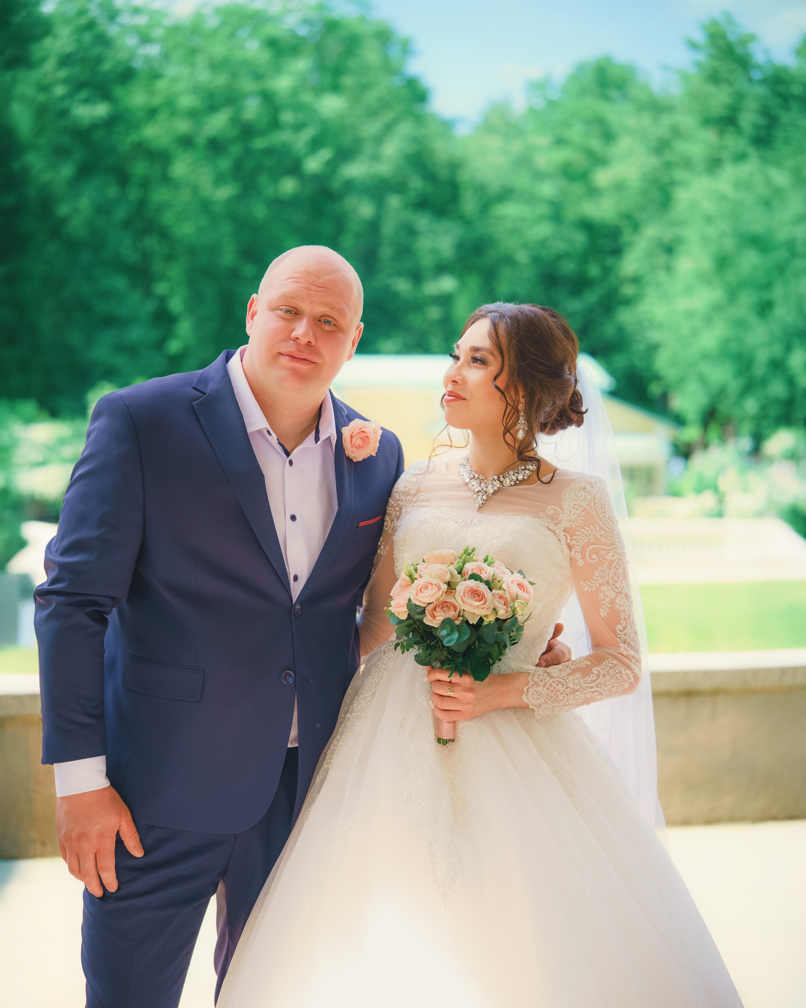 На снимке изображена молодая женщина, стоящая на элегантной каменной площадке. Ее длинные, слегка волнистые волосы обрамляют лицо, а в руках она держит нежный букет роз или пионов. Задний план – неясная архитектура, создающая атмосферу спокойствия и умиротворения. Эта фотография – прекрасный пример фотосессии, демонстрирующей женственность, стиль и элегантность.n