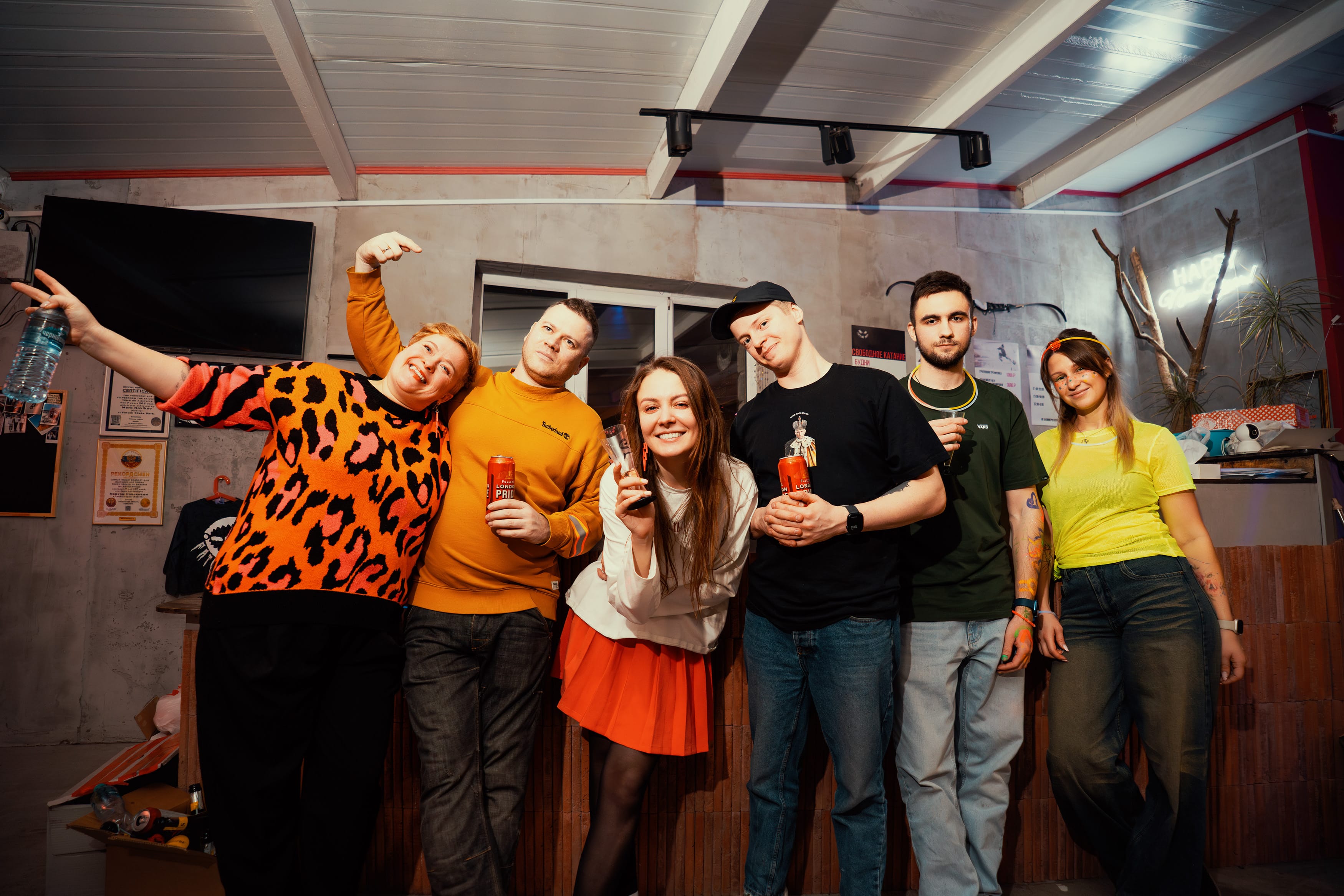 На снимке запечатлен уютный интерьер, где группа людей, одетых в разные вещи, словно переживают спокойный момент. Стены с небольшими трещинами и темной картиной добавляют снимку атмосферу тепла и ностальгии. Яркий свитер на одном из людей привлекает внимание, создавая контраст с приглушенной цветовой гаммой. Эта фотография передает ощущение домашнего уюта и дружелюбной атмосферы, словно запечатленой в повседневной жизни.