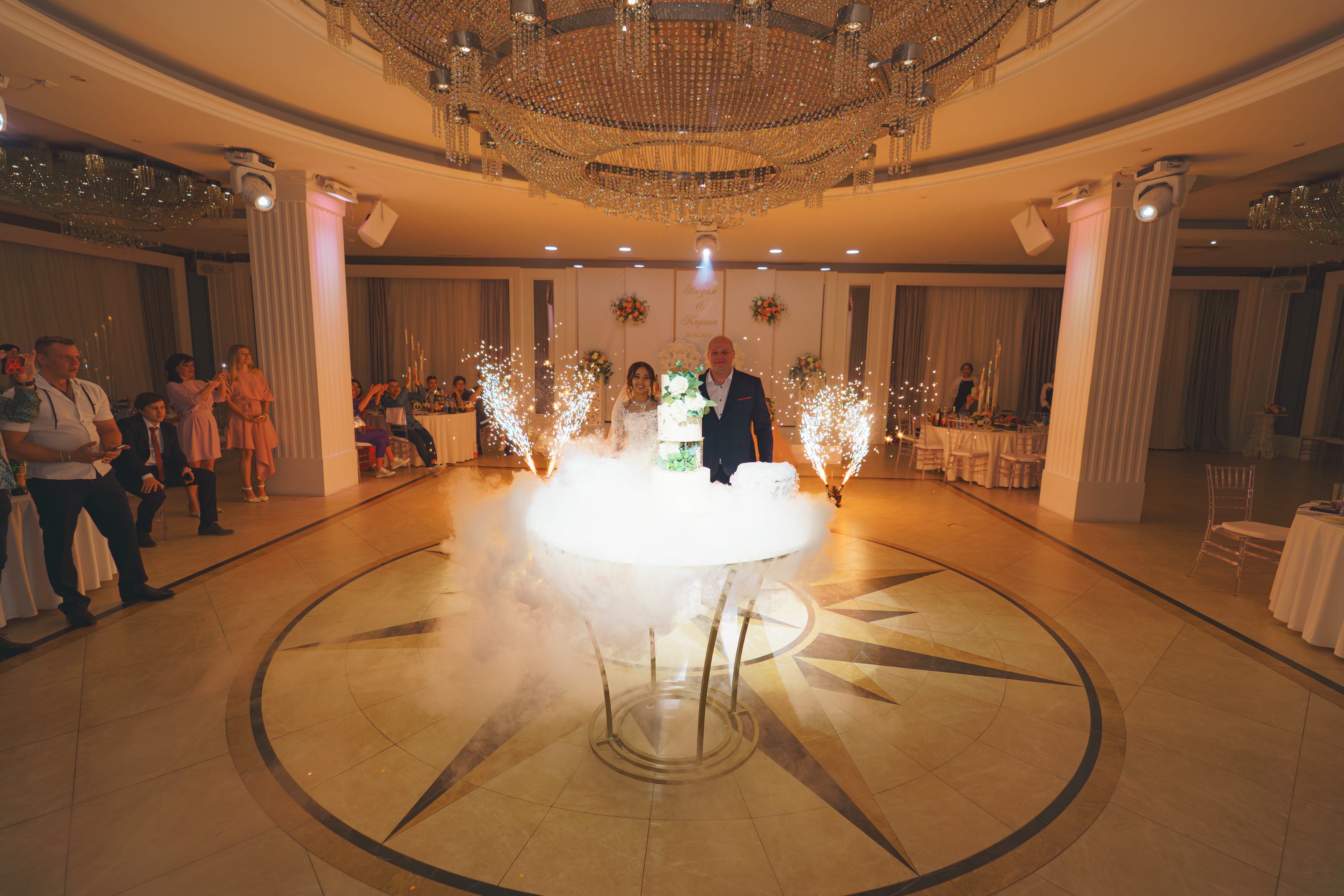 На снимке запечатлен роскошный зал, скорее всего, в отеле или ресторане. В центре внимания – мужчина, стоящий в полукруг, обращенный к зрителю. Он одет в светлый костюм, возможно, в белую рубашку, и выглядит задумчиво, как будто наблюдает за происходящим. Вокруг него – полукруг столов, на которых, кажется, разложены блюда. Светлые, почти белые скатерти дополняют атмосферу уюта и благополучия. В зале преобладают теплые, золотистые оттенки, создающие ощущение торжества и особого события.
