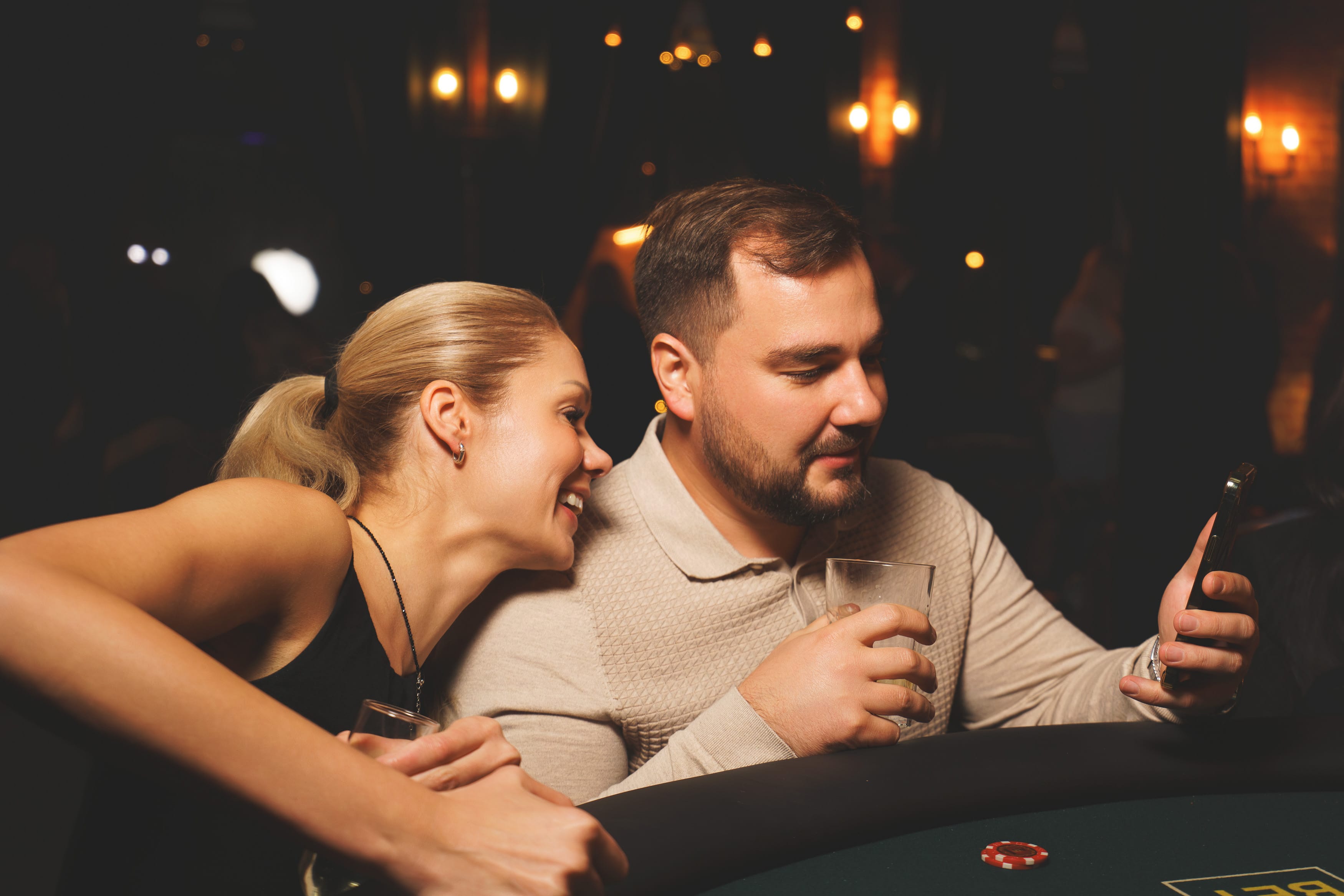На снимке – полумрачный зал, напоминающий казино, где в центре внимания – женщина в обтягивающем черном платье. Она сидит за столом, уставленным фишками и картами, в расслабленной позе, слегка наклонившись, возможно, обдумывая ход событий. Стол, покрытый бархатистым материалом, дополнен яркими фишками и картами, создавая контраст с приглушенным светом. Вдалеке видны карты, частично скрытые тенью, что добавляет интриги и ощущение ожидания. Эта фотография передает атмосферу роскоши, азарта и возможного риска.