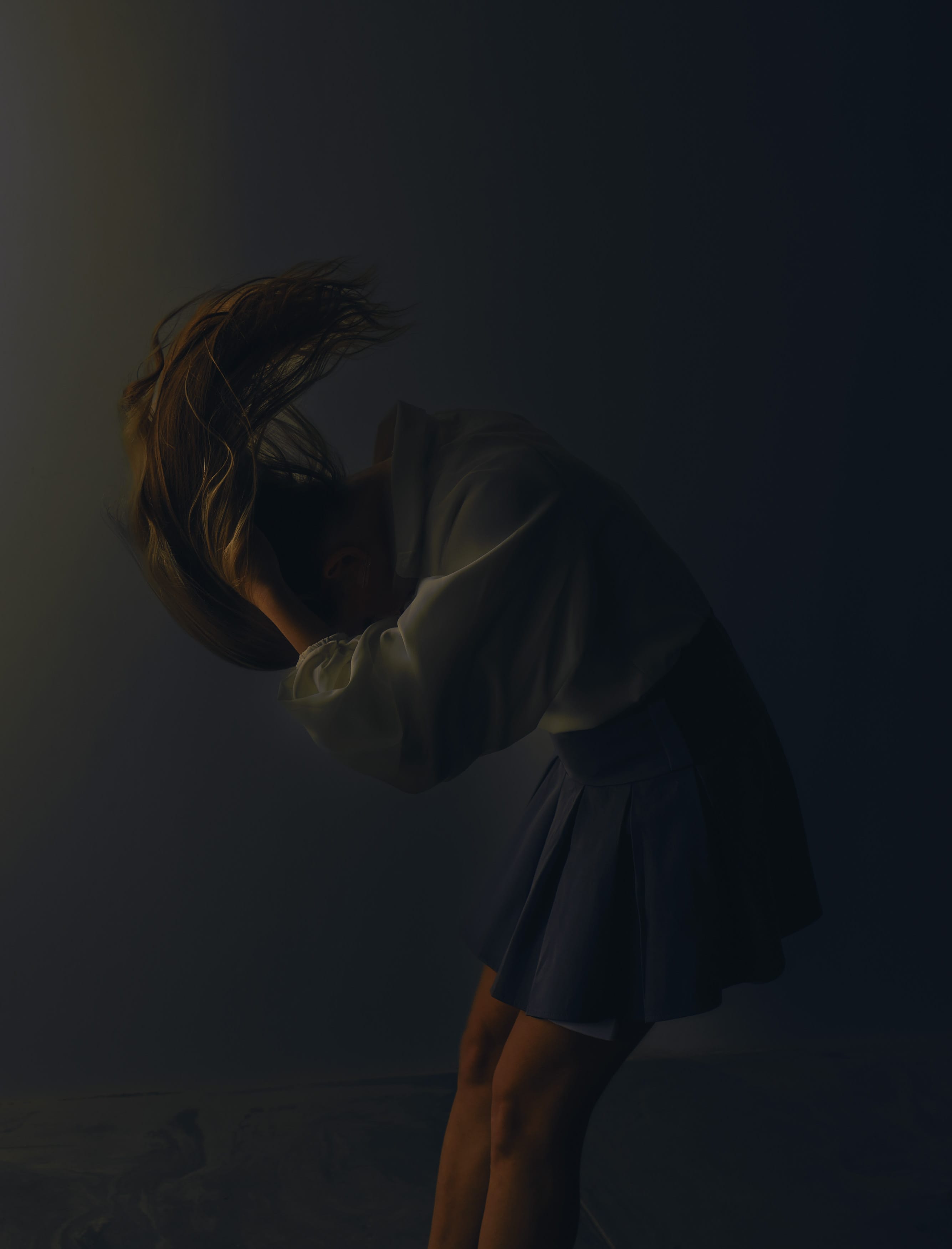 На снимке – женщина, склонившая голову вниз, в полумраке. Её фигура, в светлой футболке и брюках, занимает почти всю центральную часть кадра, создавая ощущение задумчивости и уединения. Мягкий свет, исходивший сверху, подчеркивает изгибы тела и создает драматический контраст теней. Это портрет, передающий атмосферу размышления и, возможно, некоторой грусти, в спокойной и темной обстановке.n