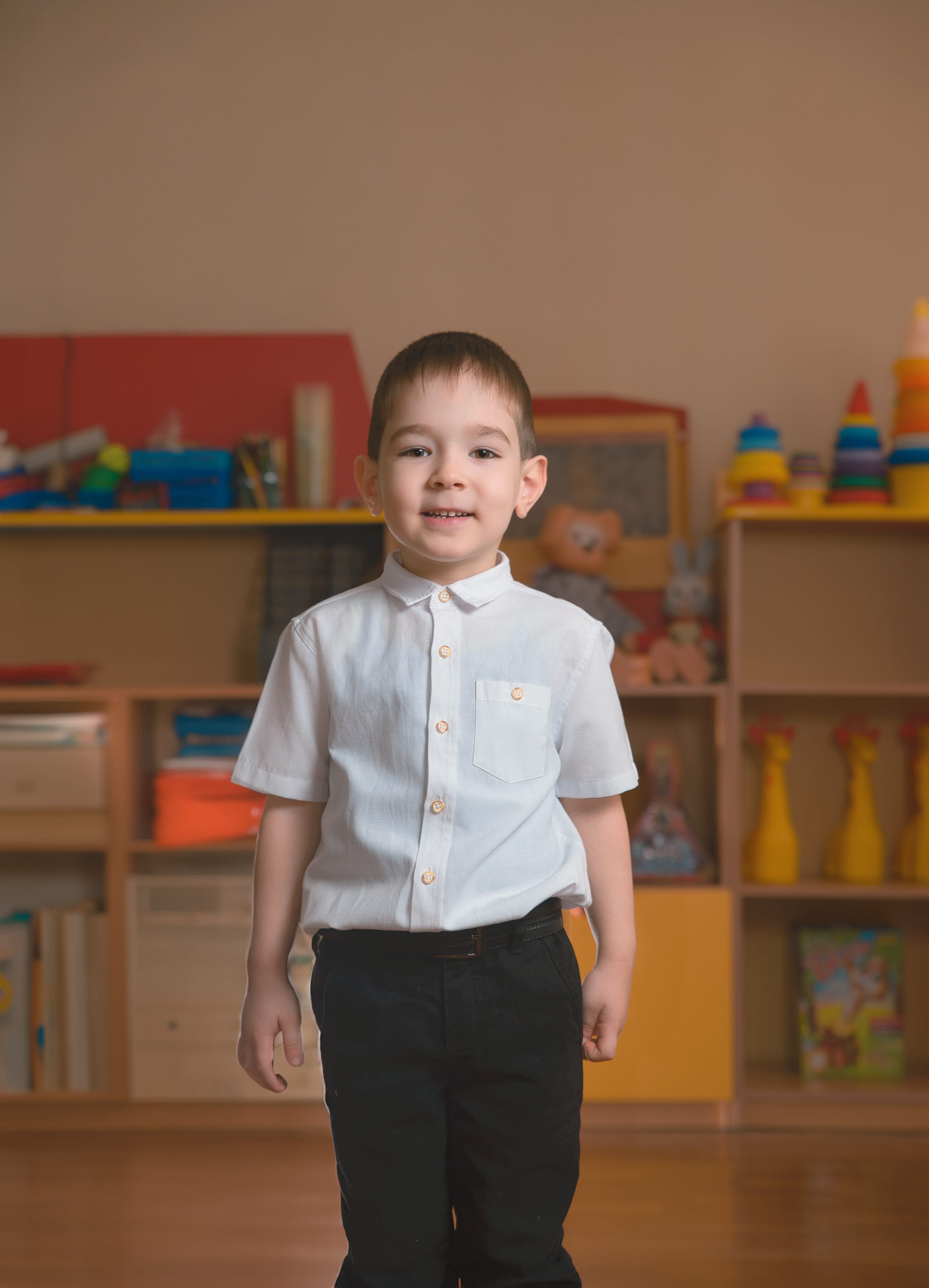На снимке изображена уютная детская комната, наполненная игрушками и книгами. В кадр попадает мальчик, стоящий прямо, с задумчивым видом. Комната, с ее деревянными шкафами и яркими коробками, создает атмосферу тепла и беззаботности. Это фото передает ощущение домашнего уюта и детской радости, идеально подходящее для поиска профессионального фотографа.n